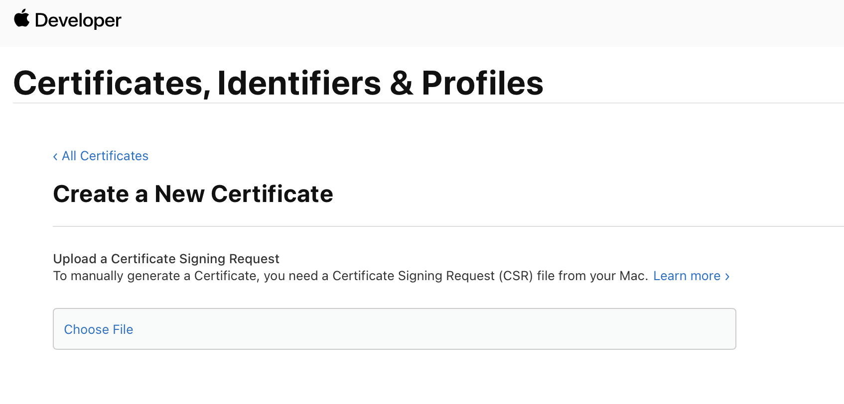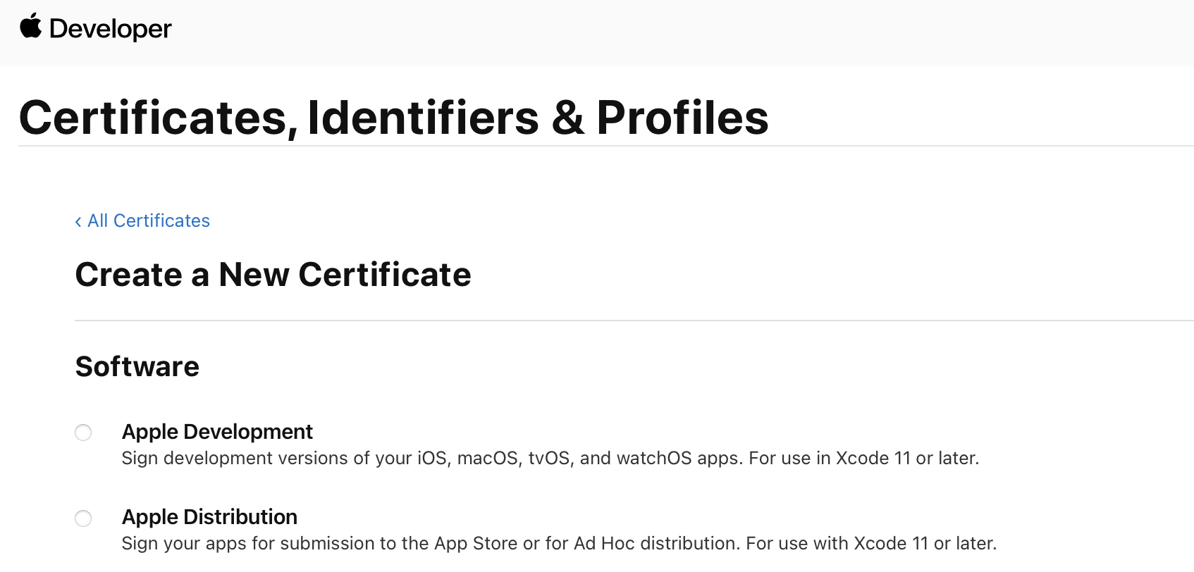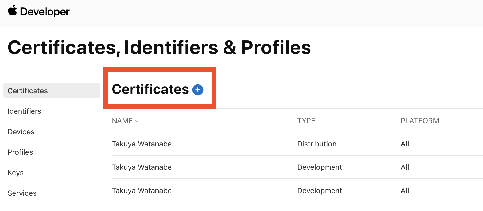 ※ リリース用の証明書を作成する場合は、証明書の種類を選択する画面において、 Apple Distribution を選択してください。