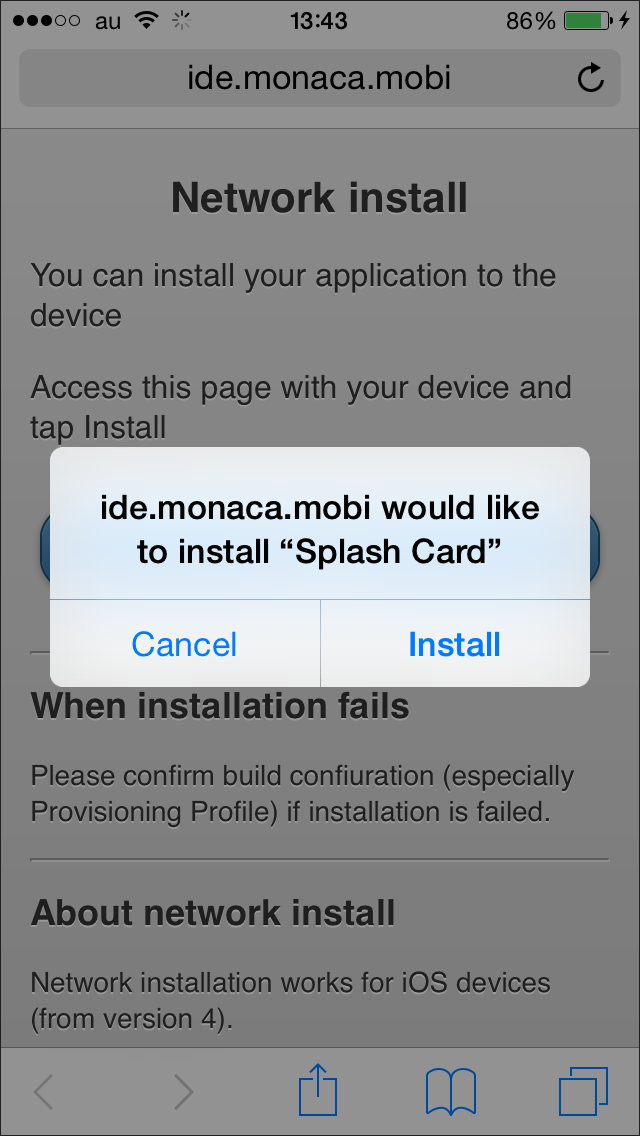 7. 接続準備の完了後、端末上からリンク先にアクセスすると、次のように、アプリのインストールが開始されます。