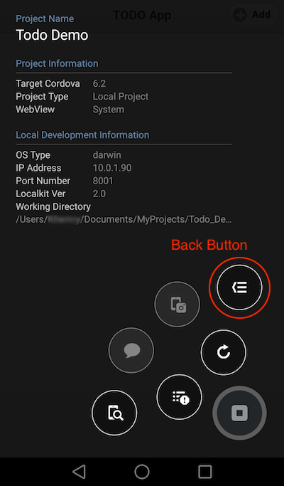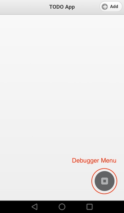 4. 下のスクリーンショットのような画面が、端末に表示されます。デバッガーメニュー上の戻るボタンをタップすれば、プロジェクト一覧画面に戻ります。